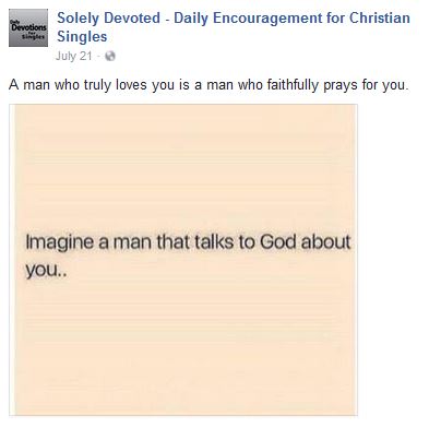 A couple of years ago I began a daily devotional Facebook page (www.facebook.com/solelydevoted) for Christian singles, and it’s grown quite dramatically, approaching 15,000 followers/likes. It’s nothing too involved, just a simple way to encourage Christian singles in their relationship with God on a daily basis. As it turns out, about 80% of those who follow the page are women, which is important to note when considering the overwhelming response to a post made to “Solely Devoted” not long ago.